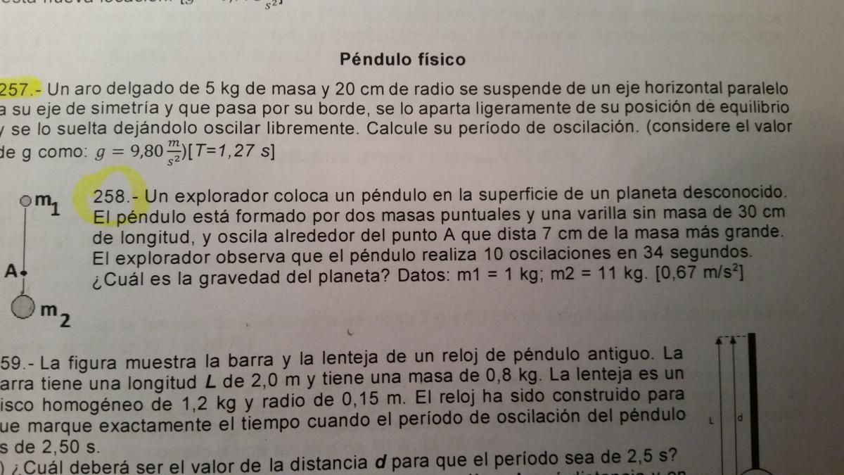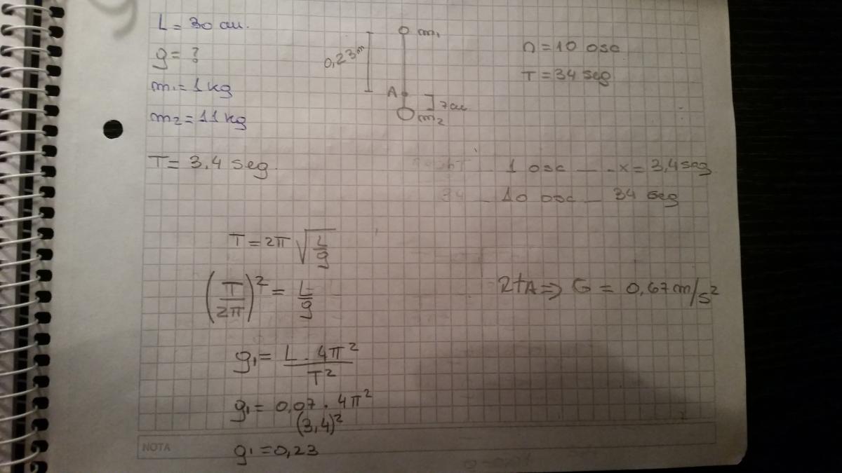 La formula del periodo que expresaste tiene que ver con un pendulo simple (una cuerda y un peso suspendido en el ) pero no con el sistema que te dan (que es un pendulo compuesto)... Por si te ayuda.. .http://www.sc.ehu.es/sbweb/fisica/solido/pendulo/pendulo.htm