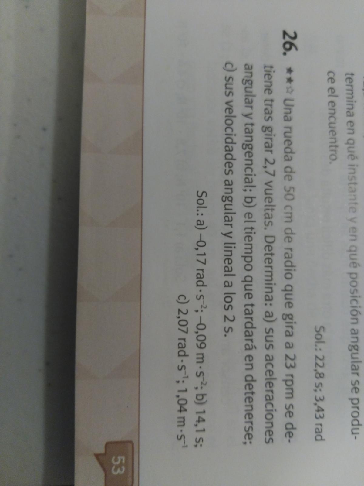 Es un ejercicio de MCUV... R=50cm, ωo=23 rpm= 23*2π/60 =2,4085 rad/s, ω=0 rad/s, θ=2,7 vueltas = 2,7*2π=16,9645 radianes