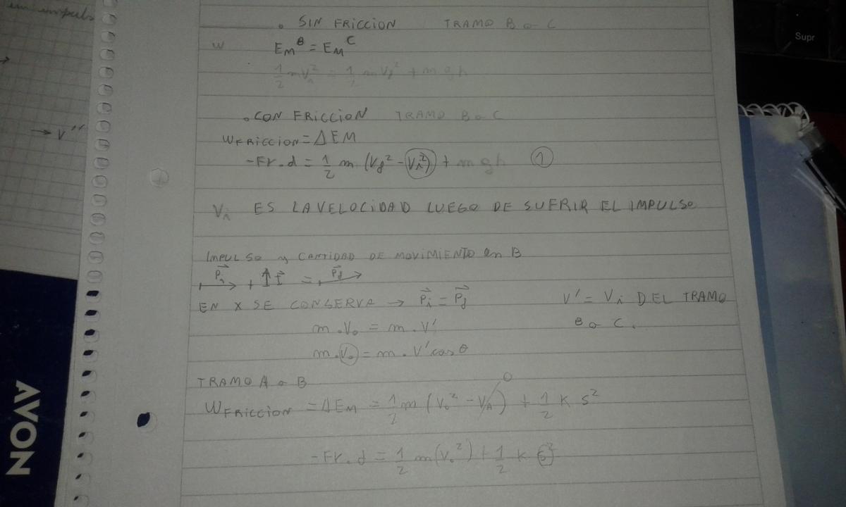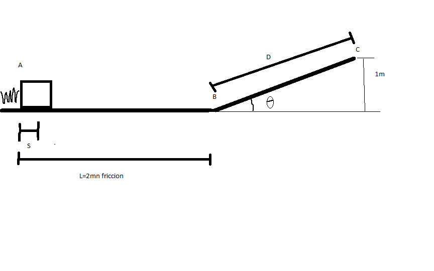 Un resorte de constante elástica K = 100 N/m se encuentra comprimido por un bloque de masa m = 1 Kg. Cuando se lo libera el bloque atraviesa un trayecto de longitud L = 2 m donde existe rozamiento y cuyo coeficiente dinámico es = 0,2 . Finalmente asciende por un plano inclinado sin rozamiento y abandonando el mismo con una velocidad cuyo modulo es 4 m/s . Considere que el plano inclinado tiene una altura h = 1 m y ángulo de inclinación = 37º.