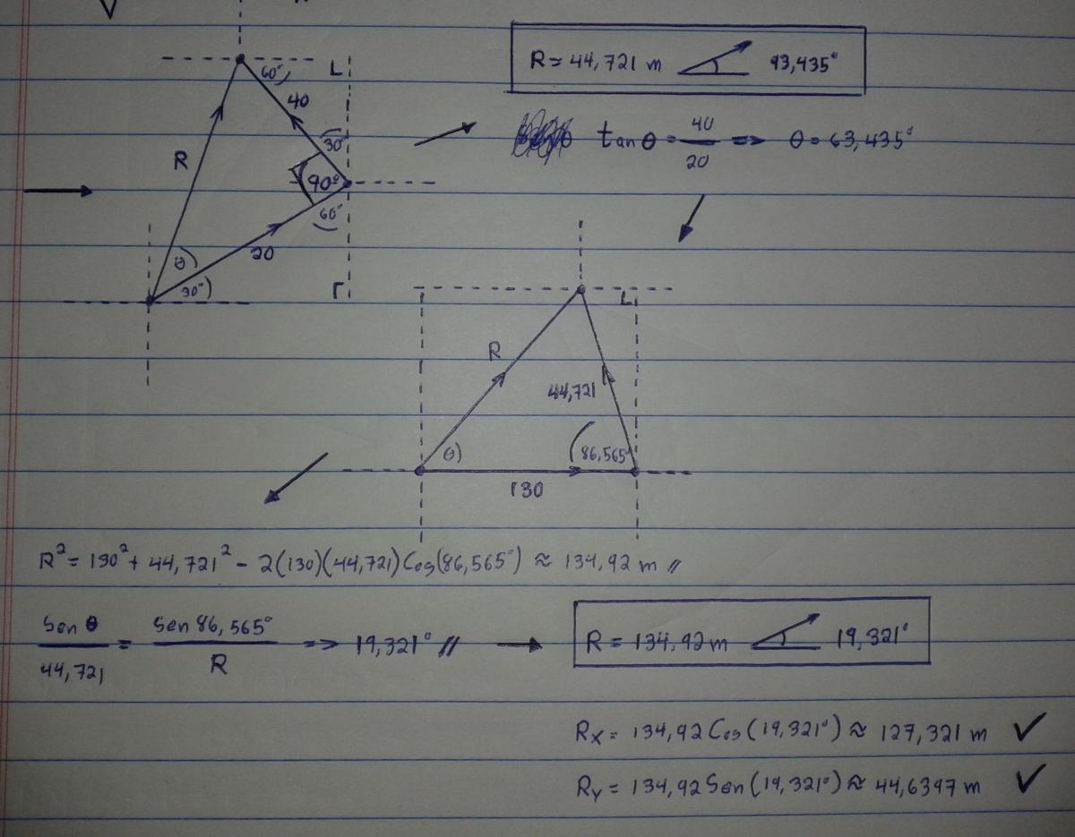 Te envió el problema asumiendo que todas las direcciones están dadas con respecto al eje +x. Por componentes rectangulares (primera imagen) y por el método del triángulo (segunda imagen). Y de paso te digo que los libros siempre tienen errores. El hecho de que hagas un problema y no te de lo que dice el libro no siempre quiere decir que el equivocado sea el estudiante. Repito: si las direcciones de los vectores están dadas con respecto al eje +x, la respuesta que te estoy dando es la correcta. Cualquiera duda, me cuentas. Saludos.