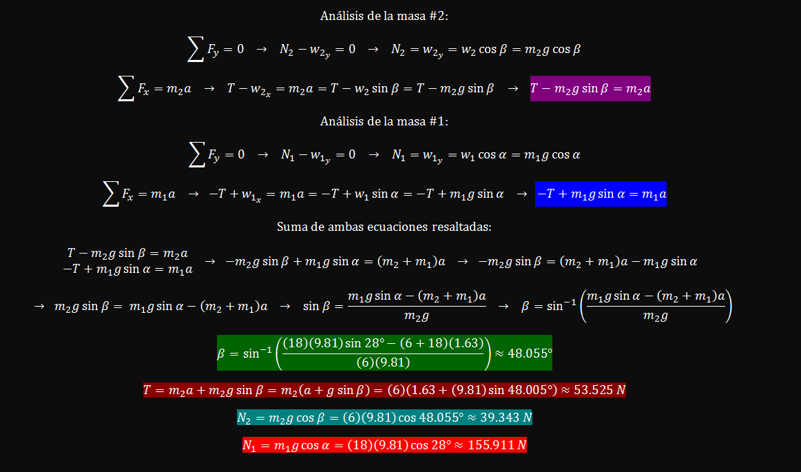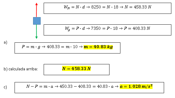 Simplemente he trabajado con magnitudes (Módulos). Cuando ha habido que calcalcular la aceleración he tenido en cuenta la fuerza que empuja hacia arriba y hacia abajo.