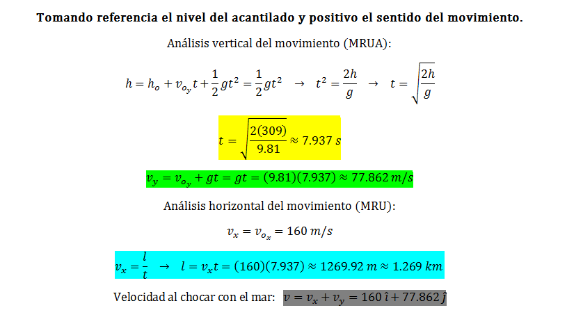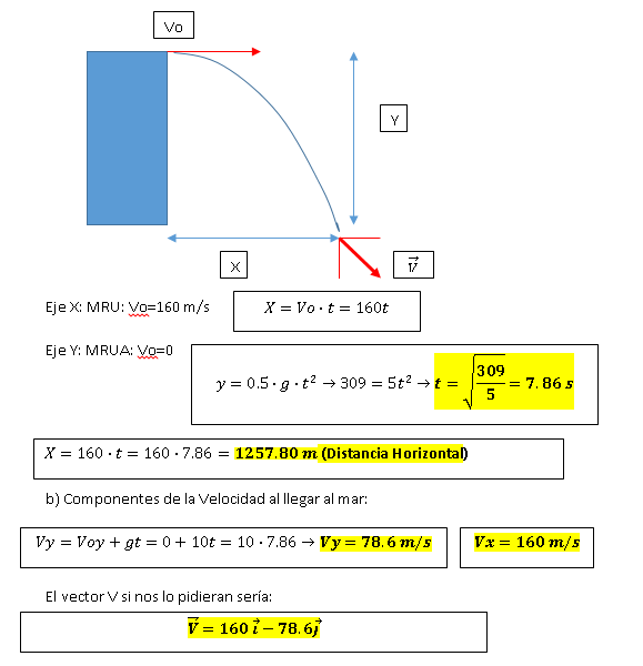 hola , buenas tardes , necesito ayuda urgente con el siguiente problema: Un vehiculo cae por un acantilado con una velocidad inicial de 160 m/s dicho acantilado tiene una altura de 309 m sobre el nivel del mar . Encuentra: a) Que tiempo tardara el vehículo en caer al mar b ) cual sera la distancia horizontal del pie del acantilado al punto de impacto del vehículo c ) cuales son las componentes horizontal y vertical de la velocidad del vehículo cuando cae al mar.