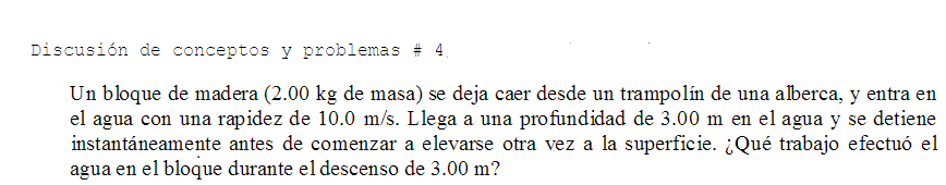 A ver, amigo Francisco Javier, en un principio lo hice igual que tu, pero después consideré que en el nivel del agua existía con respecto al nivel donde se para el cuerpo una diferencia de altura de 3 metros, con lo cual había también una Ep. Así pues, hice el segundo planteamiento, considerando una transformación total de la energía mecánica en trabajo de rozamiento del agua. Lo que escribo lo hago más bien en forma de sugerencia mía, considerando tu aseveración muy correcta en cuanto a la aplicación de Trabajo y energía igual al incremento de energía cinética. Un Saludo y gracias.