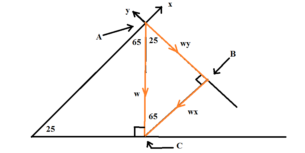 Se trata de un problema de estática. Es el típico de un sólido desplazándose por una rampa. Resulta que la rampa es un triángulo rectángulo y el ángulo opuesto al cateto más corto es de 25º. Las fuerzas que actúan sobre el sólido son la fuerza normal sobre la rampa, la fuerza de reacción de la rampa, el rozamiento y el peso. La duda la tengo al descomponer el peso según los ejes cartesianos, siendo el eje x paralelo a la superficie de la rampa. La fuerza de gravedad (el peso) se descompone en dos sobre los ejes cartesianos x e y de manera que se forman un triángulo rectángulo, siendo sus catetos estas dos fuerzas en x e y. Parece que dicho triángulo tiene que ser semejantes al que forma la rampa, es decir, que su ángulo agudo opuesto a su cateto más corto tienen que ser de 25 grados a la fuerza. ¿Por qué? ¿Qué criterio de semejanza de triángulos rectángulos se sigue? ¿Es independiente del módulo del vector peso por muy largo que éste sea? Gracias.