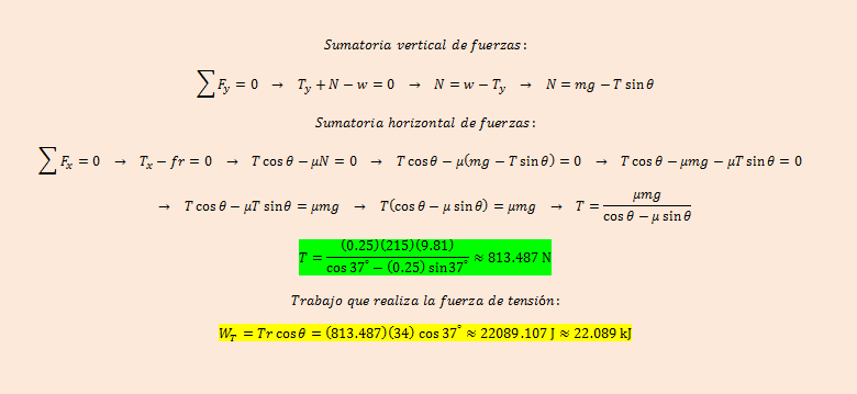 Con una cuerda que forma un Angulo de 37 grados con la horizontal, es desplazado un objeto de 215 kg hasta una distancia de 34 metros, considerando un coeficiente de fricción de 0.25. Calcula la fuerza o tensión de la cuerda y el trabajo necesario para desplazar el objeto
