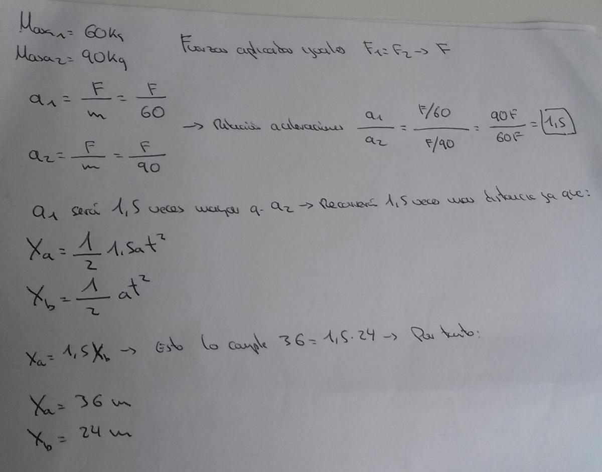 Hola muy buenas. Tengo dudas con este ejercicio. Les dejo la pregunta y lo que he hecho. Basicamente al no decir nada de las fuerzas asumo que son iguales las dos aplicadas y por tanto al calcular la aceleracion de cada uno la del cuerpo A seria 1,5 veces mayor que la del B y por tanto al partir del reposo recorrera 1,5 veces mas distancia y la respuesta correcta seria Xa=36m y Xb=24m. ¿Es correcto? No se si me dejo algo o en la pregunta falta algun dato.