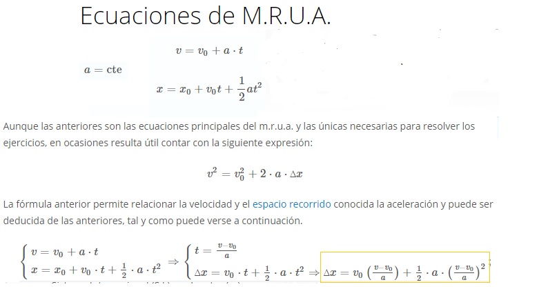Sabemos que tendremos que utilizar las 3 ecuaciones del movimiento rectilineo uniformemente acelerado (MRUA), por tener a=constante...y en algún caso conviene saber deducir (o aprender) una 4ª fórmula (encuadrada en color amarillo), la cuál nos proporciona directamente el tiempo que emplea el móvil en recorrer una distancia conocida (14.500 m)