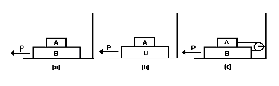 En las tres figuras de abajo se muestran dos bloques. El bloque A pesa 39.5 N y el B pesa 78.5 N. El coeficiente de rozamiento cinético en todas las superficies es 0.25. Calcular la fuerza P necesaria para arrastrar al bloque B hacia la izquierda a velocidad constante, si a) A queda en reposo con respecto a B; b) A se mantiene en reposo con respecto a la base, y c) A y B está unidos por una cuerda ligera que pasa por una polea fija sin fricción.