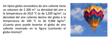 Halla el peso del aire que contiene el globo con la densidad del aire caliente y el volumen (d=m/v.. m=d.v).. Con la masa podrás saber el PESO (P=m.g)...