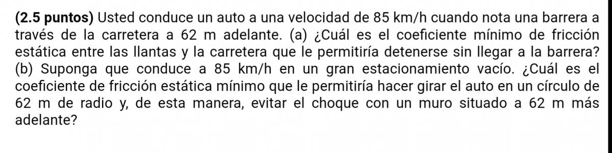 Aplicando MRUA... v²=vo²+2.a.d.... 0=(85.1000/3600)² +2.a.62... De aquí obtendrás la aceleracion con la que frena...