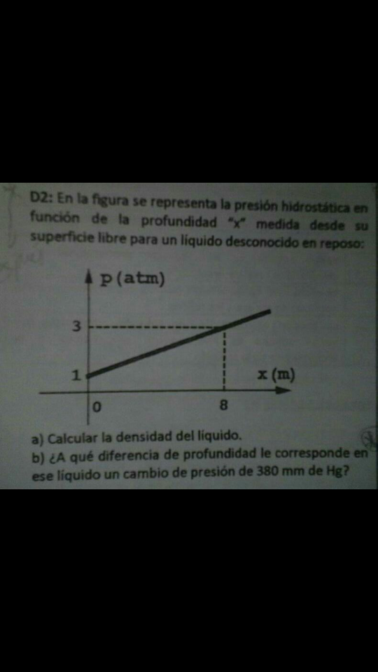 Para el b)... de nuevo la misma formula.. 380 mmHg . (1 atm/760 mmHg). (101300 Pa / 1 atm) = x. d. 9,8.... He pasado los mmHg a Pascales... Como ya conocemos la densidad, simplemente despejamos "x"