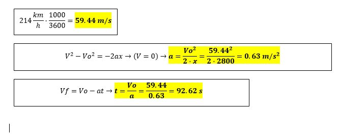 Un tren que circula a 214 Km/h frena y recorre 2800m antes de pararse. Calcula:
