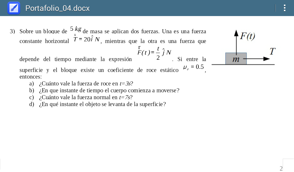 Para t=3, simplemente sustituye t por 3... El bloque empezará a moverse cuando T>Fr... 20> 0,5. (t/2-5.g)... Resuelve esa inecuacion y sabrás el instante a partir del cual empiza a moverse...