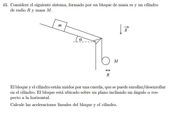 quiero saber cómo se relacionan las aceleraciones de los cuerpos, es decir, luego de establecer las ecuaciones a través de la segunda ley de Newton, no comprendo cómo varía la aceleración del bloque con respecto a la aceleración del cilindro (que posee aceleración angular y del centro de masas)