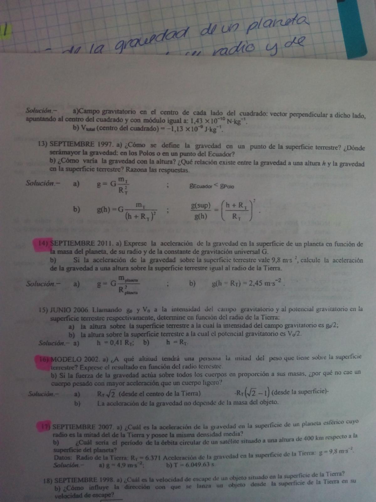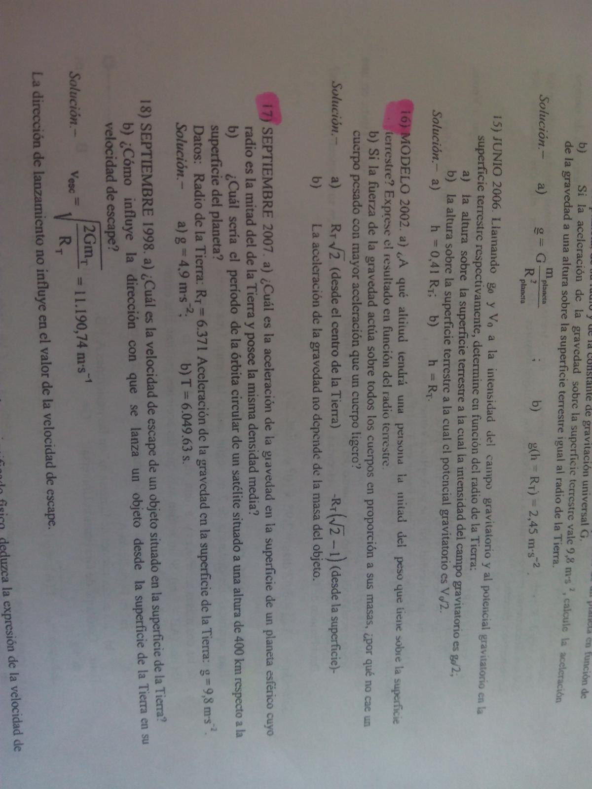 Muy buenas, estamos trabajando en clase de física ejercicios de la Pau de años anteriores correspondientes al tema de campo gravitatorio.Existen dos problemas que se me resisten y me gustaría preguntar si alguien pudiera orientarme a la solución o el planteamientoque debo tomar. Serian el 17 y 14.Gracias anticipadas![]()