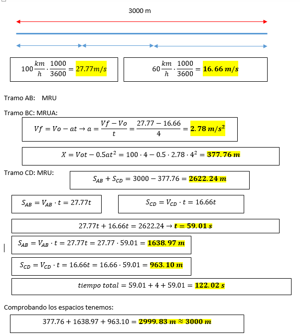 Hola me ayudan con este problema: En el recorrido de un distancia de 3km un automovilista parte del sitio A con una velocidad de 100 km/h y la mantiene constante hasta llegar al punto B se ve obligado a frenar durante 4 s para reducir la velocidad hasta 60km/h en el sitio C; desde este punto continúa con velocidad constante hasta llegar a su destino en D. Calcular distancia recorrida en cada seccion del trayecto y el tiempo total del recorrido, suponiendo que el tiempo empleado de A a B es igual al que necesito para ir de C a D