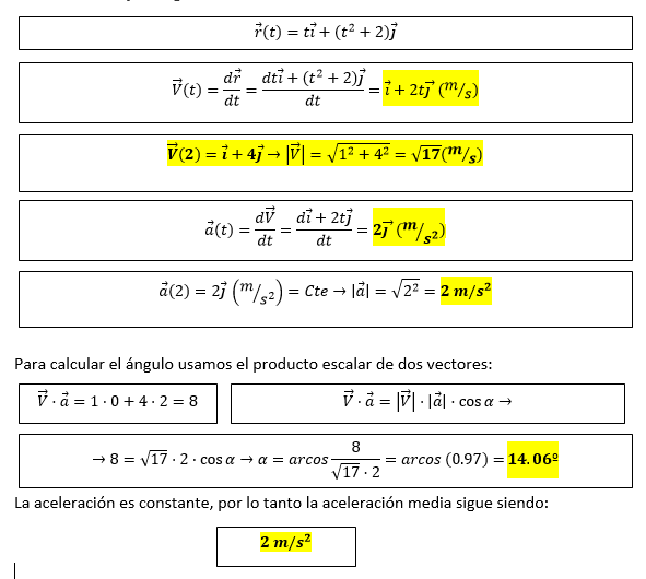 Calcular la posición, velocidad y aceleración en el instante t=2s, el ángulo que forman el vector de velocidad y aceleración en instante t=2s; La aceleración media entre 0 y 2 segundos.
