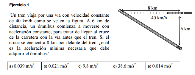 X = Xo + Vo . t +( a . t^2)/2 ; siendo X 10km, pasado a metros 10.000m (esta distancia la hallas con pitágoras siendo los catetos 6km y 8km), Xo=0m, Vo = 0m/s, y t= 720seg (lo hallado anteriormente). De esta manera, tu incógnita será sólo la aceleración, con la que el auto mínimamente debería ir para llegar a cruce al igual que el tren.