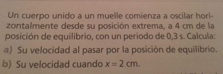 Te piden su velocidad cuando x=0 y cuando x=2. Para ello deberás obtener las expresiones de x(t) y v(t)... Está explicado detalladamente en todos los vídeos de M.A.S. Un abrazo!