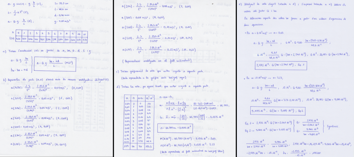 En el apartado b) que represente los puntos (n, acceleración) de acuerdo con las medidas realizadas y utilizando (2). En el c) me piden que encuentre la recta graficamente que mejor se ajuste a los puntos. En el d) me piden que encuentre la misma recta pero por regresión lineal. Y en el apartado e) que es el que no encuentro el error, me piden que determine Q i h0 (altura inicial).