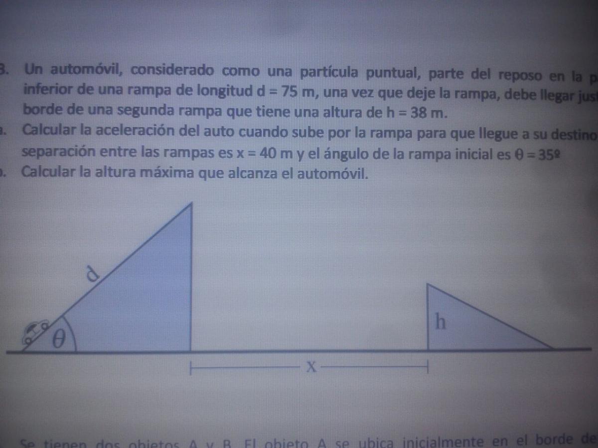 a. Calcular la aceleración del auto cuando sube por la rampa para que llegue a su destino si la separación entre las rampas es x = 40 m y el ángulo de la rampa inicial es = 35º