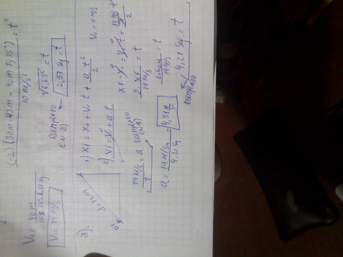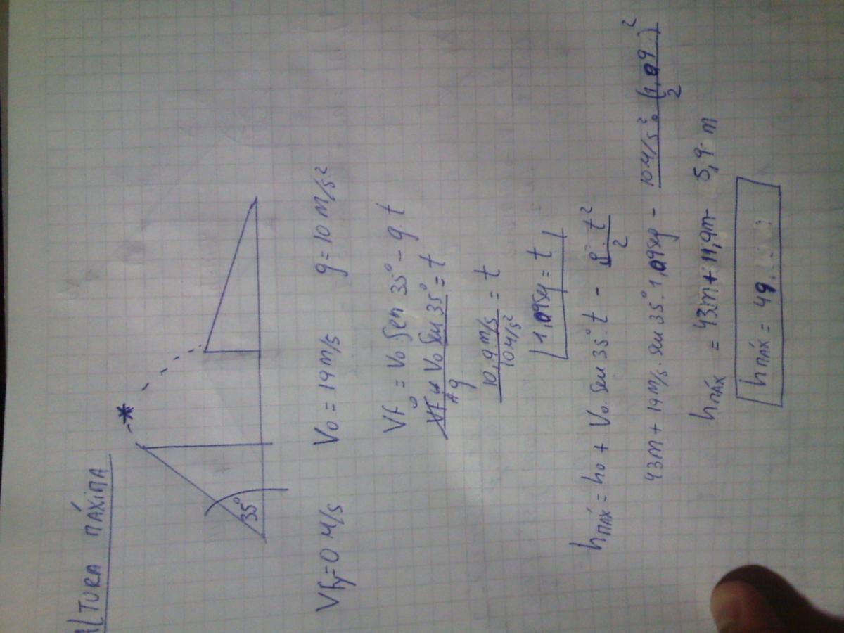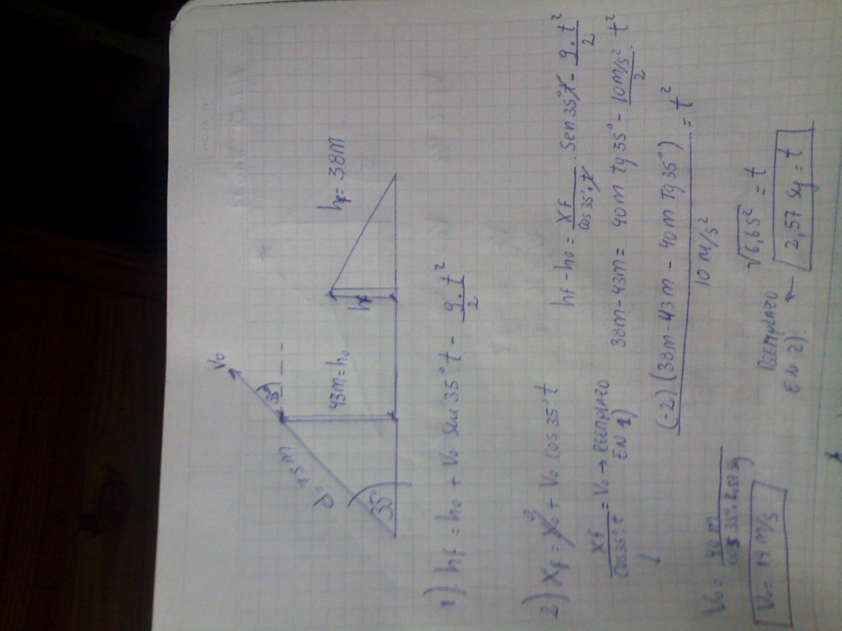 Primero, se trata de un tiro oblicuo de rampa a rampa, siendo la altura inicial ho= 75m . sen35° y la altura final hf=38m, gravedad 10m/s2.