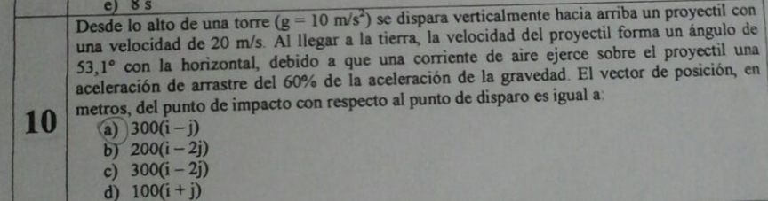 Hola unicoos me pueden aclarar este problema: Se lanza verticalmente hacia arriba un objeto con una velocidad de 20 m/s. Sabiendo que la aceleracion de arrastre es de 6m/s^ y que la velocidad final forma un angulo de 53,1º con la horizontal en el suelo. Halle el vector posición. Respuesta 300(i-j)