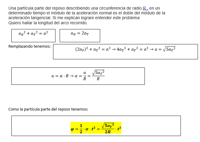 Una particula parte del reposo describiendo una circunferencia de radio R , en un determinado tiempo el modulo de la aceleracion normal es el doble del modulo de la aceleracion tangencial. Si me explican lograre entender este problema