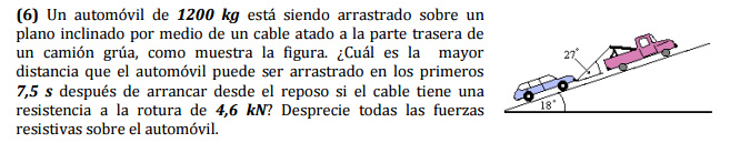 Pxc=m·g·sen18=1200·10·sen 18=3708.20 N Planteamos: Tx-Pxc=m·a→4600·cos 27-3708.20=1200a→a=0.325 m/s² (aceleración máxima con que se puede tirar sin que se rompa el cable)