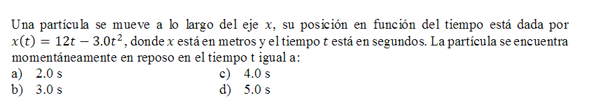 Jenni... Que la partícula este momentáneamente en reposo significa que aún no recorrió nada, esta quieta. Es decir, que esta en la posición 0 metros. Tienes que ir probando con los valores que te dan. Fíjate que cuando el tiempo es 4.0 seg, la posición es de 0 metros. Por lo tanto verifica.