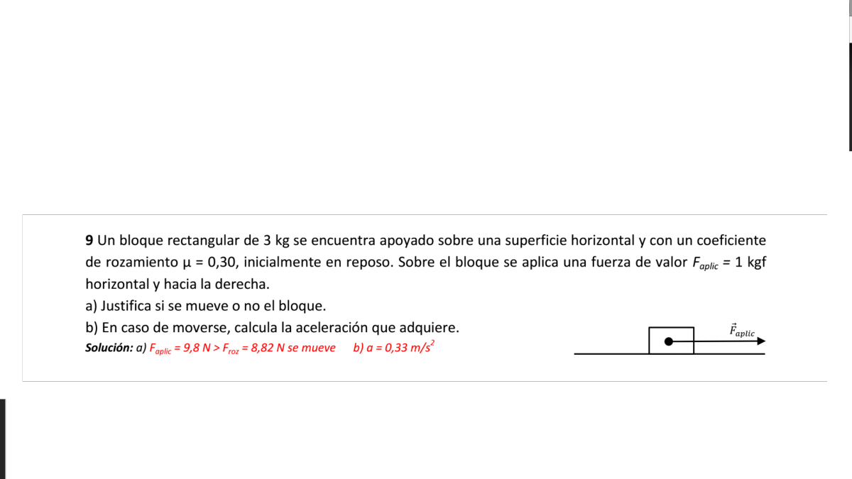 Si suponemos ahora que el sistema está inicialmente en reposo y que los coeficientes rozamiento estático y dinámico entre la masa de 10kg y el plano son 0.25 y 0.15 respectivamente. ¿Quedará el sistema en reposo?. Sino es así, ¿Cuál será la aceleración y la tensión en la cuerda?. Rta. a = 2.03m/s2 y T = 26.7N