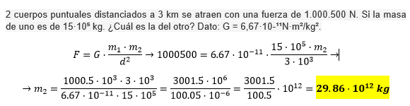 2 cuerpos puntuales distanciados a 3 km se atraen con una fuerza de 1.000.500 N. Si la masa de uno es de 15·10⁵ kg. ¿Cuál es la del otro? Dato: G = 6,67·10-¹¹N·m²/kg².