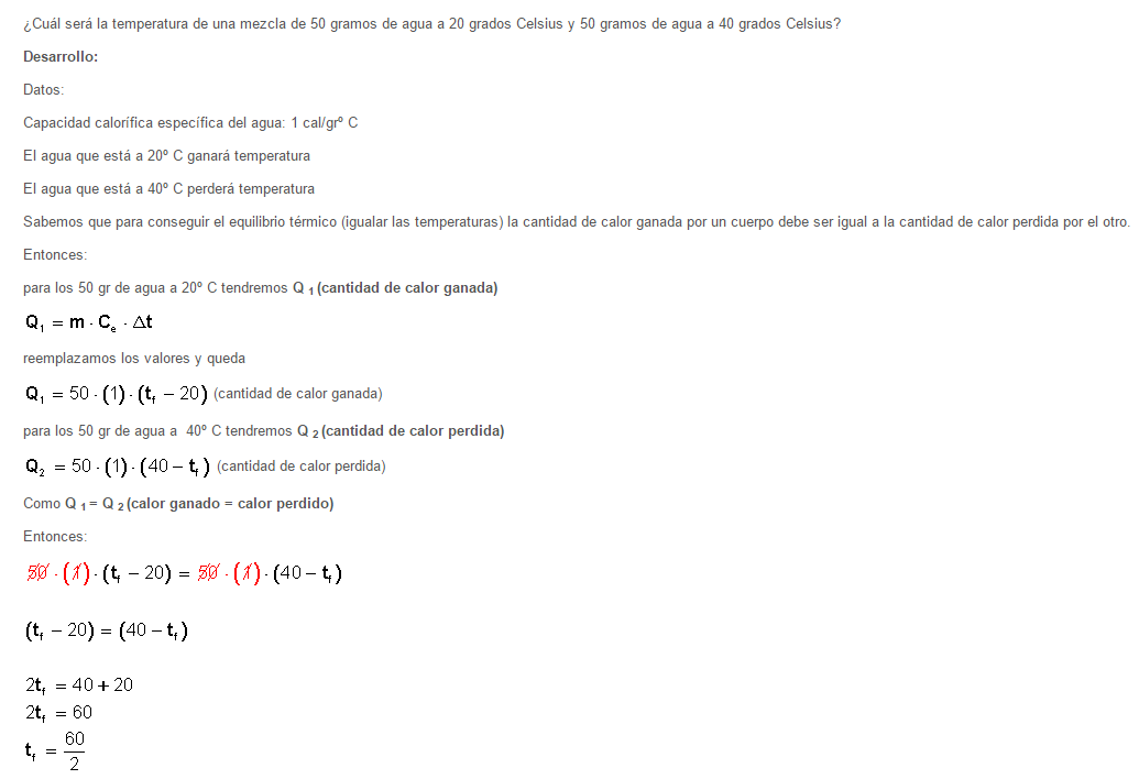 Como el calor perdido por un cuerpo es igual al ganado por el otro tenemos:
