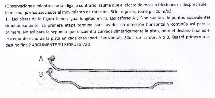 Como no existe rozamiento, la energía potencial de cada una es la misma en el punto de partida. Por conservación de la energía tiene que ser la misma en el punto de llegada, eso sí transformada en energia cinética. Asi siendo ambas Ec iguales lo serán sus velocidades y por lo tanto llegarán al mismo tiempo. Eso es lo que deduzco. No sé si me equivoco en algo. un Saludo.