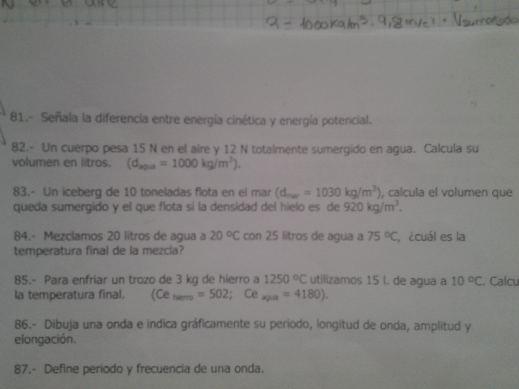Hola. No se como resolver este ejercicio, he calculado el volumen total del iceberg con la fórmula de la densidad y el resultado ha sido 10,87 litros. No se si calcular el volumen era necesario para el ejercicio, ni como seguir. Si me pudieran ayudar. Gracias