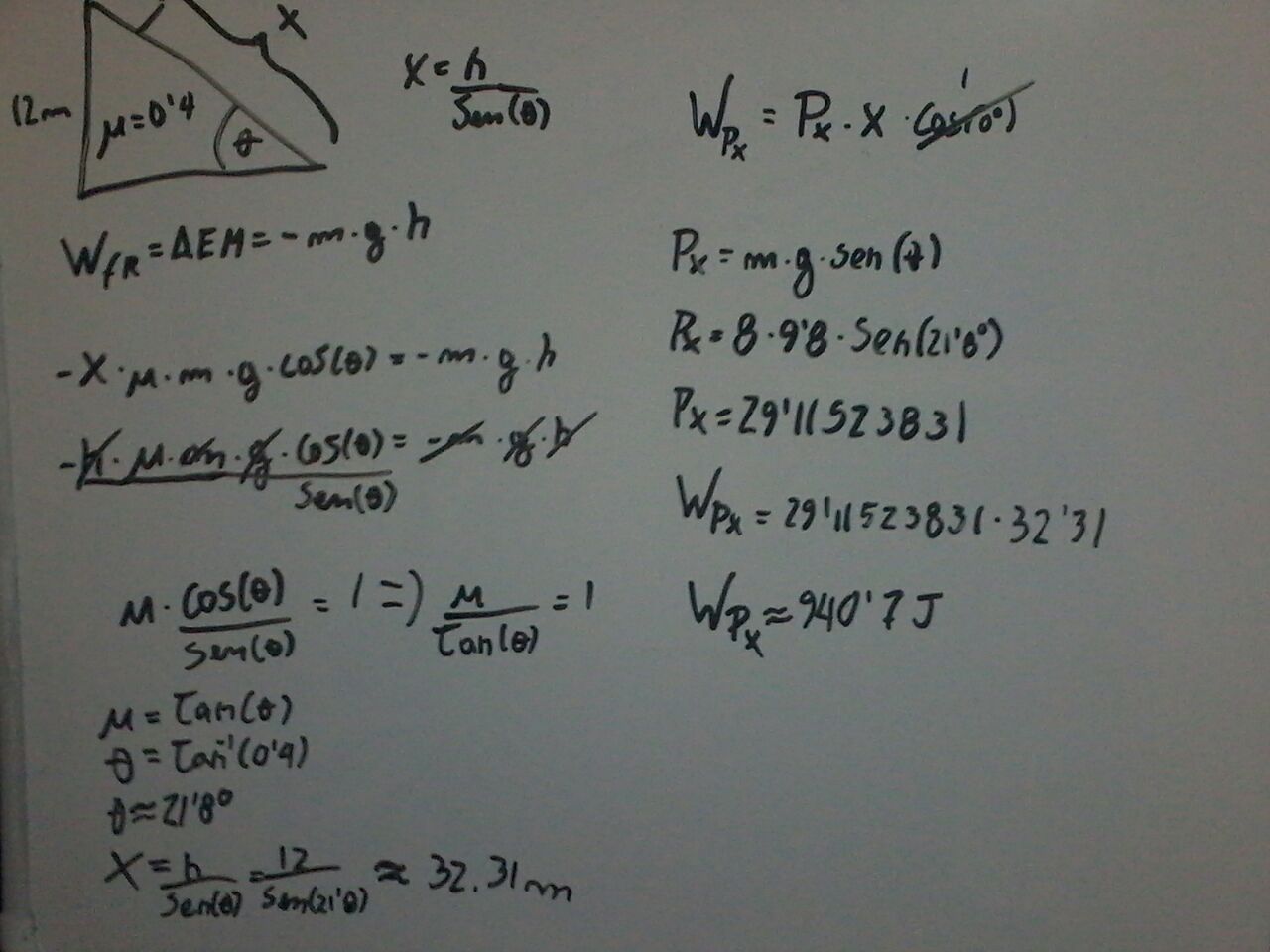 Se tiene un bloque a 12 m de altura sobre un plano inclinado, el cual tiene una masa de 8 kg, y posee un coeficiente de roce dinámico de 0.4. El bloque se desliza desde lo más alto a lo más bajo, manteniendo una velocidad constante. En el enunciado original propuesto en el video, se pide hallar el trabajo realizado por la fuerza de rozamiento...yo por mi parte, quise hallar el trabajo realizado por la componente x de la fuerza peso...para mi sorpresa, ambos trabajos son iguales en magnitud, y opuestos en sentido. Es esto correcto? y de ser así, bajo qué condiciones se cumple esto?.