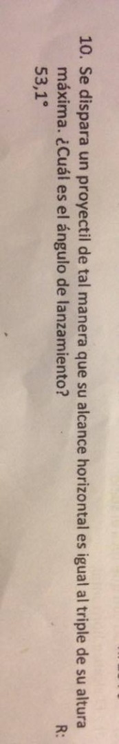El segundo ejercicio dice: Se lanza un proyectil de tal manera que su alcance horizontal es igual al triple de su altura máxima ¿Cual es el angulo de lanzamiento?
