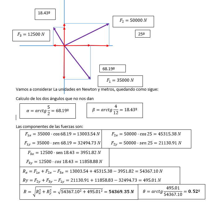 Alex: Te lo subo hecho. He usado unidades del sistema internacional, es decir Newton y metros. Tu si quieres haces la conversión. Es fácil pero muy laborioso. Espero no haberme equivocado en los cálculos, pero el sistema de hacerlos te sirve igual. Se calcula al final la Fuerza resultante de las tres y el ángulo que forma, que en este caso está casi en el eje X. UN Saludo.