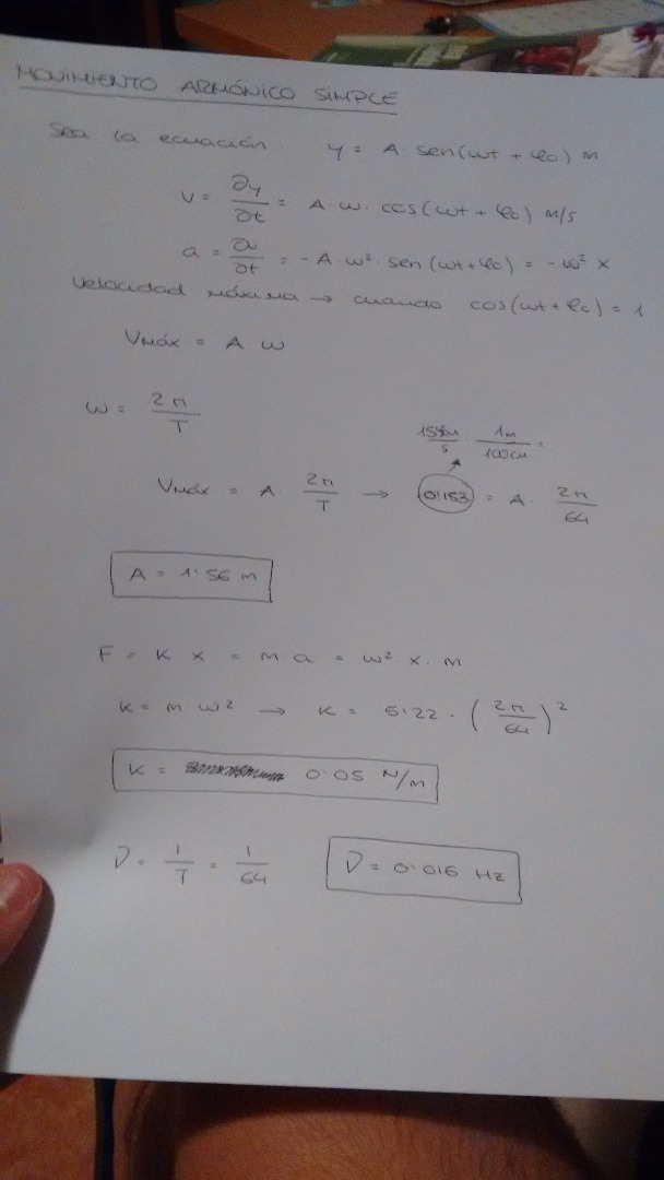 Para hacer correctamente este ejercicio se debe tener muy claro cual es la ecuación de posición del movimiento armónico simple, y su primera derivada (velocidad) y su segunda derivada (aceleración). La velocidad máxima tiene lugar cuando el coseno de la fase es 1, por lo tanto, la velocidad máxima es proporcional al producto de la amplitud del movimiento oscilatorio por la frecuencia angular de este. Siguiendo la segunda ley de Newton sabemos que F = ma, es igual a la fuerza expresada en la Ley de Hooke (F=kx). La aceleración del movimiento se extrae de las conversiones con la aceleración del movimiento obteniendo al final que k=mw2. Para finalizar, saber que la frecuencia es la magnitud inversa del periodo, de aquí hallamos su valor.