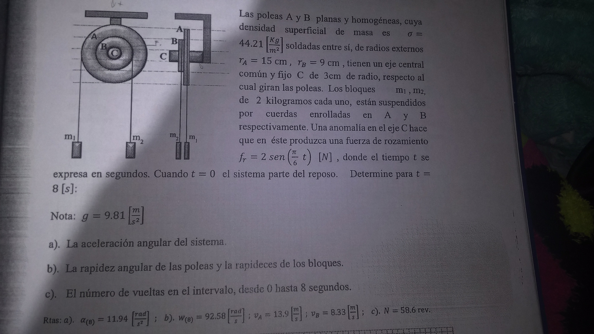 Estaba mirando videos de inercia eh entendido muchas cosas pero tengo un problema con este ejercicio realizo todo el procedimiento pero al final me queda 1.1772-0.06 sen(π/6*t)=2.1243α si reemplazo t en 8 no me da la aceleracion angular q deberia tener la respuesta del libro a menos que el libro este mal. en fin acepto todo tipo de sugerencias y ayudas :)
