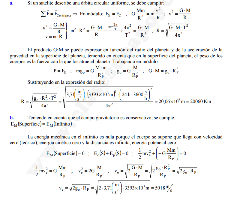 Lo que tienes que hacer para determinar la masa del planeta es igualar las dos fórmulas más famosas de Newton (2ª ley y Gravitación universal)