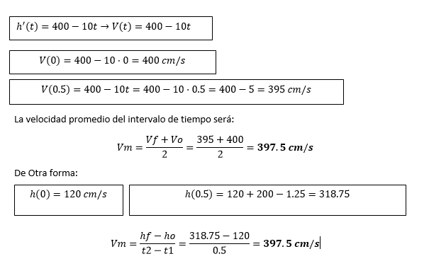 Hola que tal, yo entiendo esto.... evalua los tiempos q te dan en la altura dada, en t=0 sera tu altura inicial q segun veo te da 120, luego en t=0,5 sera tu altura final que te da 318,75, luego te dan la formula de velocidad promedio que es igual a delta h sobre delta t....delta h es h final menos h inical y delta t es t final menos t inicial, hace la operacion y ya.....espero haberte ayudado