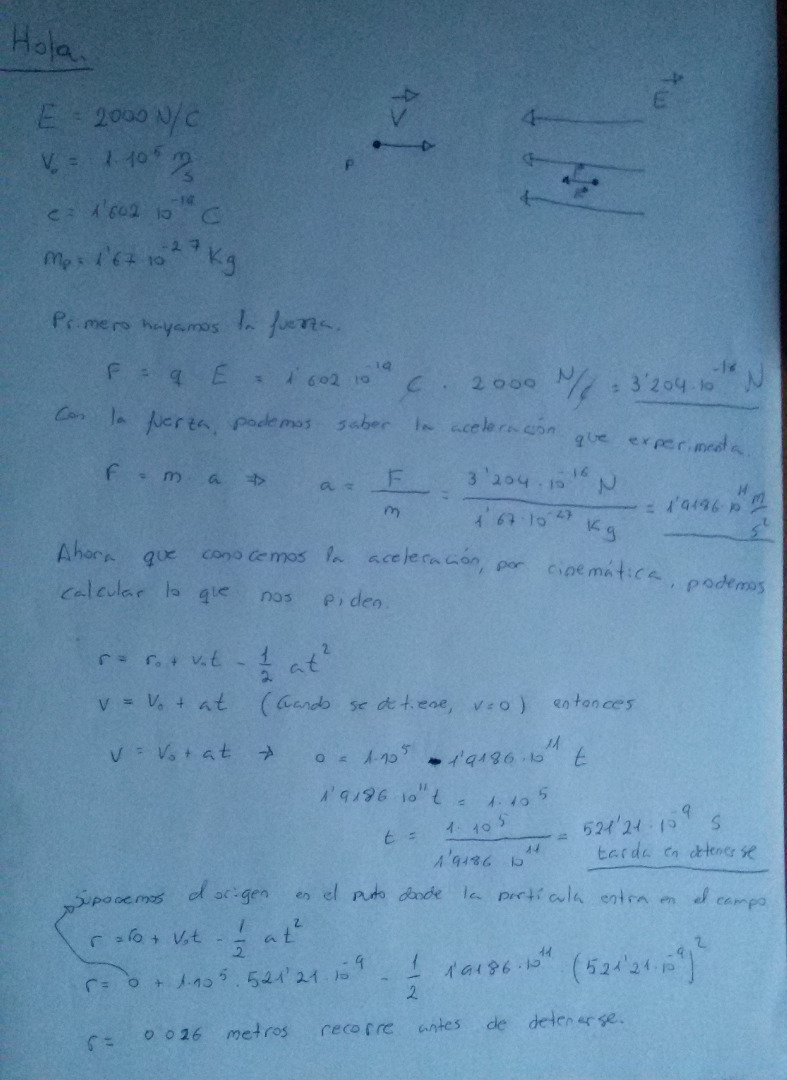 Me he quedado atascada en este ejercicio, podríais ayudarme dice así: En una región de el espacio hay un campo eléctrico uniforme de Intensidad E=2000N/C. Se lanza un protón con una velocidad de 10^5m/s en sentido contrario al campo. Cuál es la distancia que recorre como máximo hasta pararse?