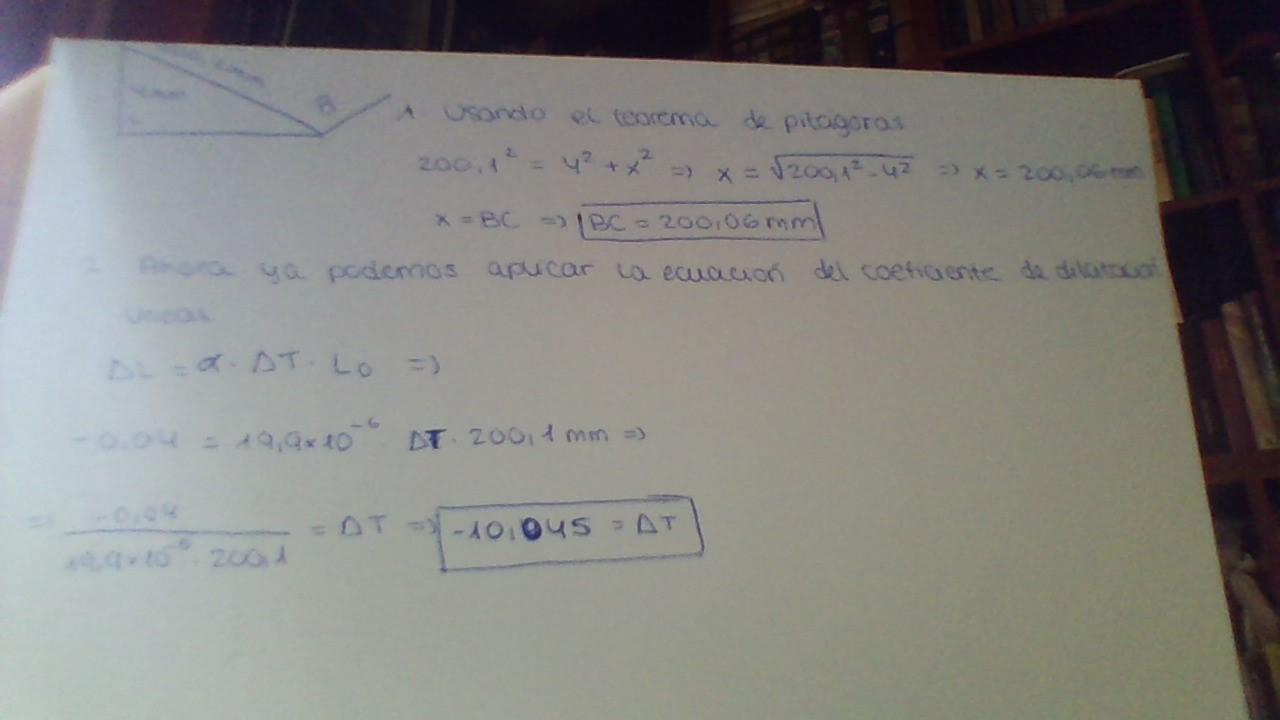 Primero usas pitagoras para calcular la distancia BC y luego usas la formula del coeficiente de dilatacion lineal ( AL= alfa x Lo x AT) y despejas AT y asi obtienes que el incremento de temperatura ha de ser -10,045º es decir que la temperatura ha de disminuir en 10,045º. Un saludo !!