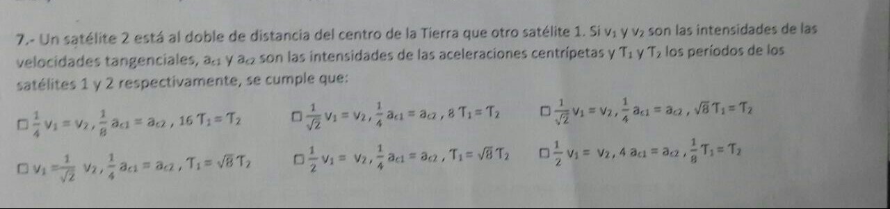 Hola Fernando, si no me equivoco, podrías buscar las relaciones a partir de la tercera ley de Kepler que relaciona periodos y radios (T1²/r1³=T2²/r2³) todo partiendo del dato que te da la letra sobre la relación entre los radios de las órbitas de los satélites.