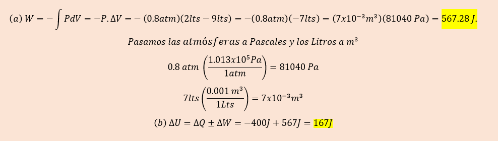 Un gas se comprime a una presión a 0,8 atm de 9 litros a 2 litros. En el proceso 400 J de energía salen del gas por calor. ¿Cúal es el trabajo realizado sobre el gas? y ¿Cúal es su variación de energía interna?