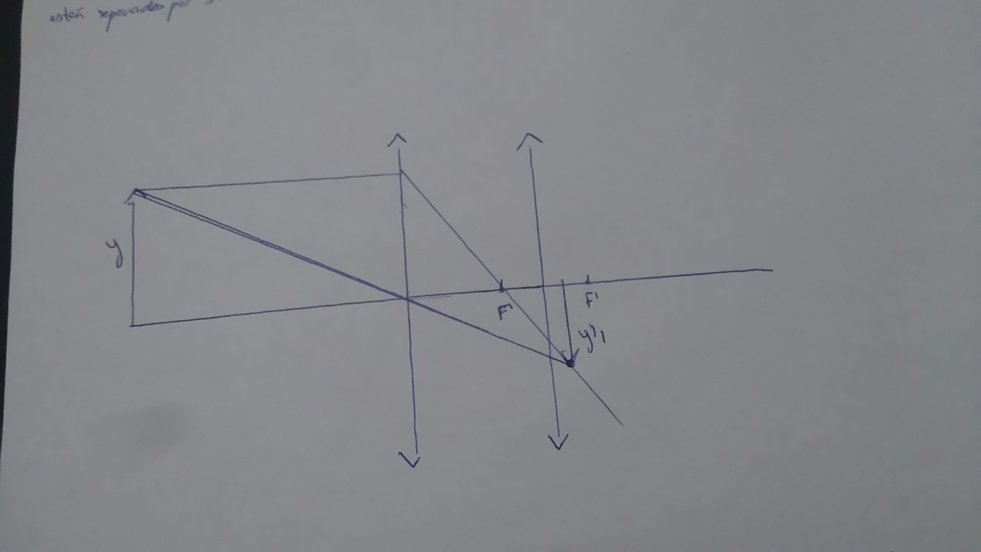 Mi problema está en que se trata de la combinacion de dos lentes convergentes pero a la hora de realizar el diagrama de rayos para encontrar la imagen me encuentro perdido y solo llego hasta aquí,gracias de antenmano.