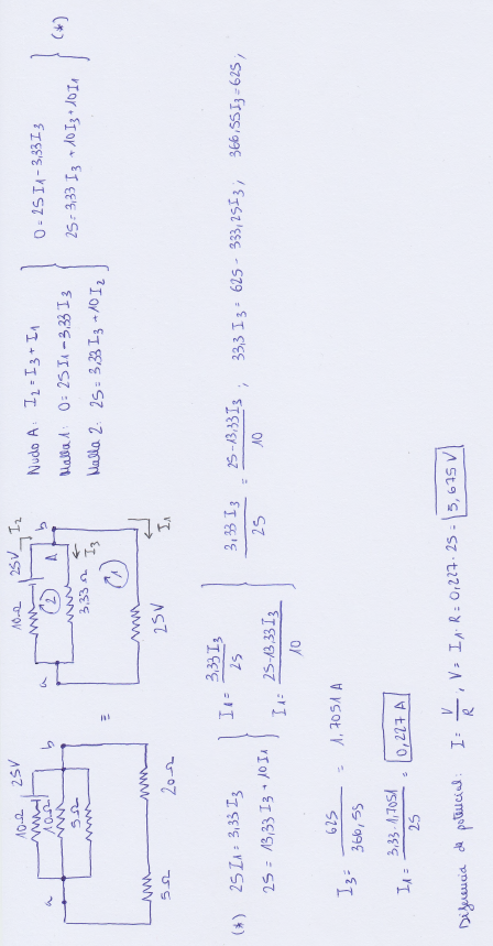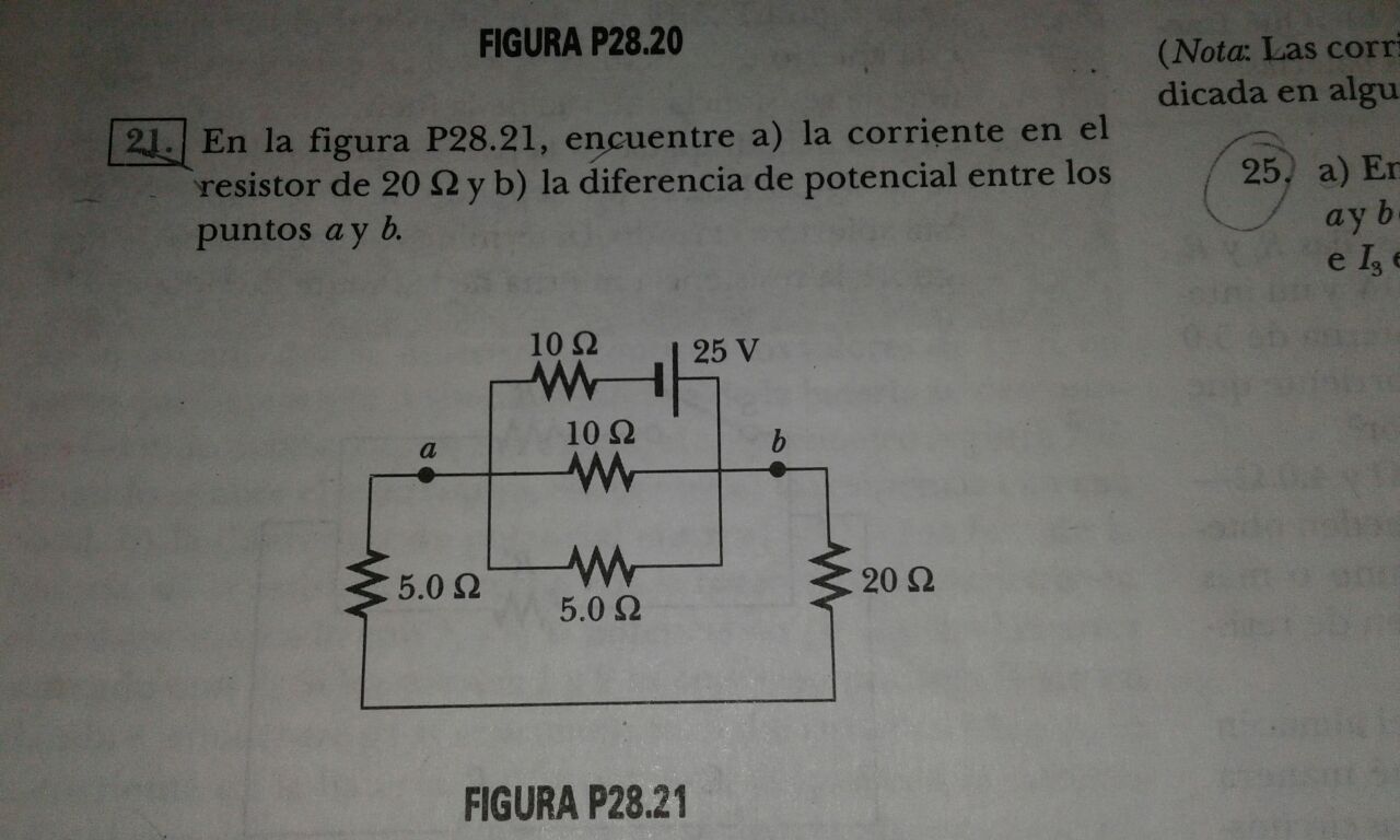 Necesito ayuda con este ejercicio por favor, no me dan los resultados indicados en el libro que son 0,227A y 5,68V ... sume las resistencias en paralelo y luego las resistencias en serie, pasa obtener la resistencia equivalente, calculé la intensidad de corriente total, luego los voltajes de cada resistencia para así poder calcular la corriente en el resistor de 20 ohm, pero aún así no me da el resultado