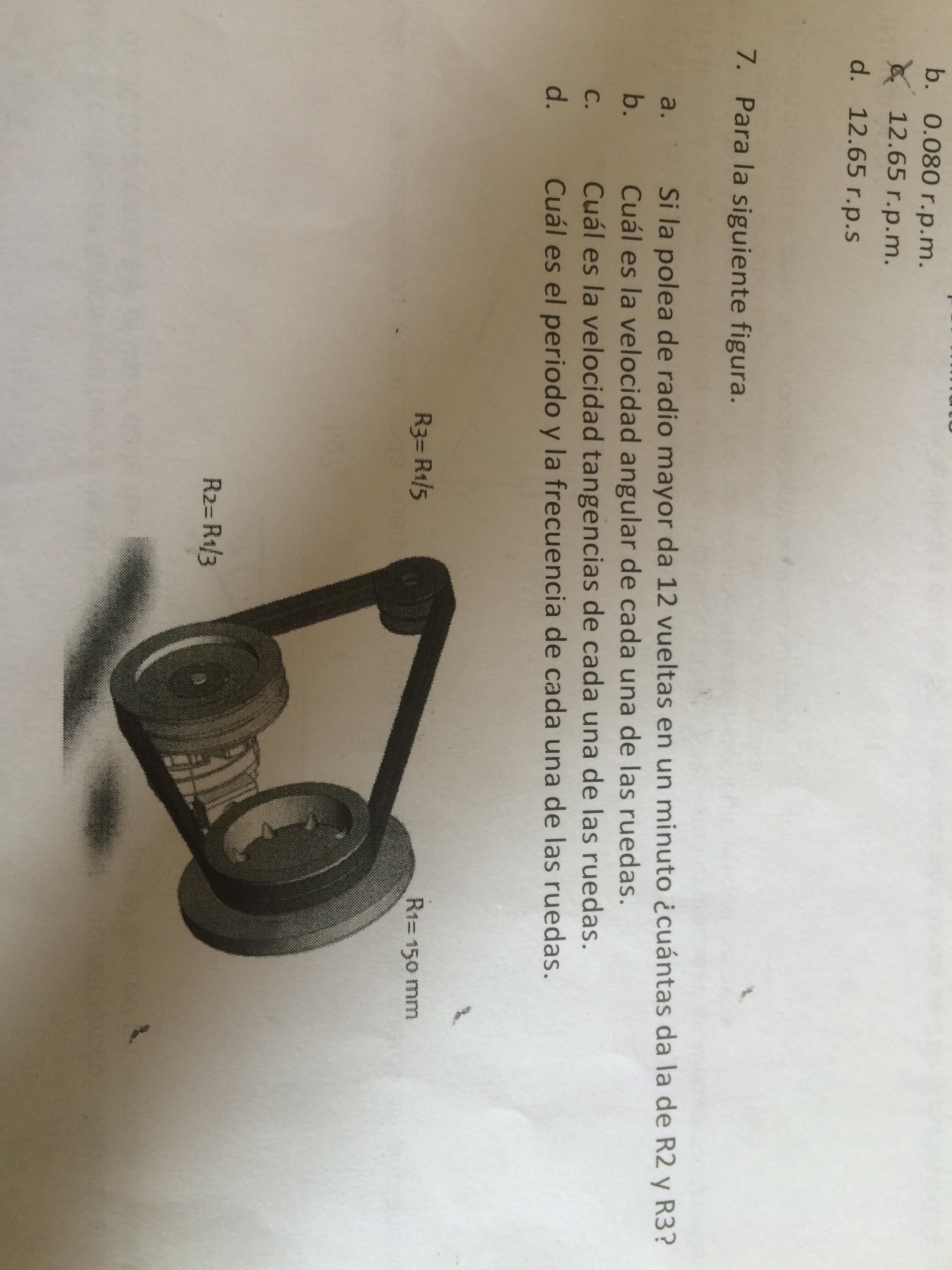 Tres poleas que manejan una misma "cuerda" con diferente radio c/u. Debo calcular la velocidad angular pero mi duda es si solo hay que calcular 1 o la de las 3 puesto que si haces ese cálculo hay que tener en cuenta el periodo y el periodo en cada una cambia ya q el radio es diferente en cada una, entonces mi duda es si debo calcular velocidad angular en las3 o solo en 1 lo mismo con el periodo y la frecuencia.