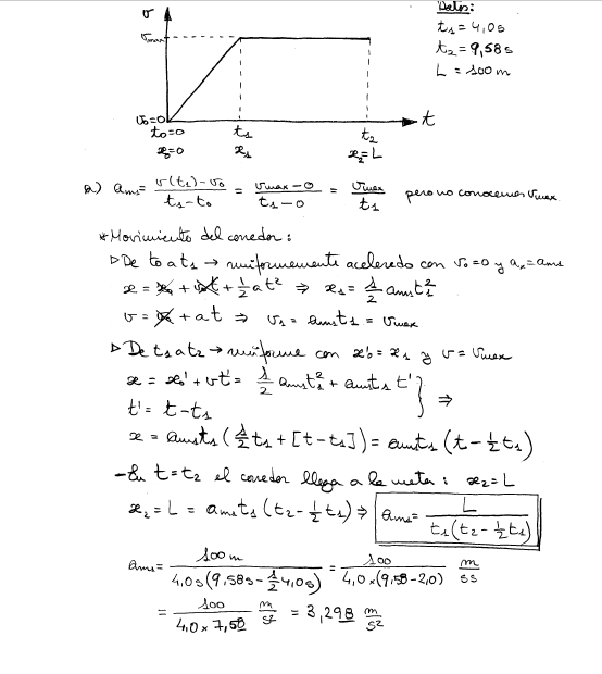 En las olimpíadas de Beijing, Husain Bolt de Jamaica estableció un nuevo récord del mundo en los 100 m lisos (planos) con una marca de 9.69 s. Supongamos que aceleró desde el reposo con aceleración constante y que alcanzó su velocidad máxima en 4s, la cual mantuvo hasta llegar a la meta. ¿Cuál fue su aceleración en la prueba?